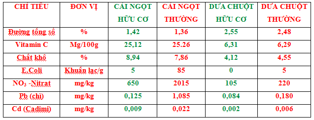 Có thể thấy rằng hàm lượng dinh dưỡng của rau hữu cơ đều cao hơn mẫu thường mặc dù mẫu mã không đẹp. Các chỉ tiêu dư lượng hóa học đảm bảo an toàn thực phẩm đều thấp hơn so với mẫu rau thường, đặc biệt tồn dư Nitrat và Ecoli đều thấp hơn ngưỡng cho phép nhiều lần.