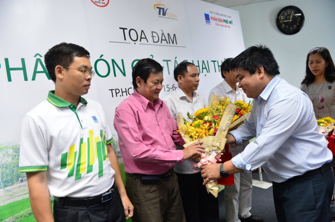 Ông Lê Thế Chữ – phó tổng biên tập báo Tuổi Trẻ tặng hoa cho các khách mời tham dự tọa đàm Phân bón giả – tác hại thật sáng 15-6 tại tòa soạn báo Tuổi Trẻ – Ảnh: Quang Định